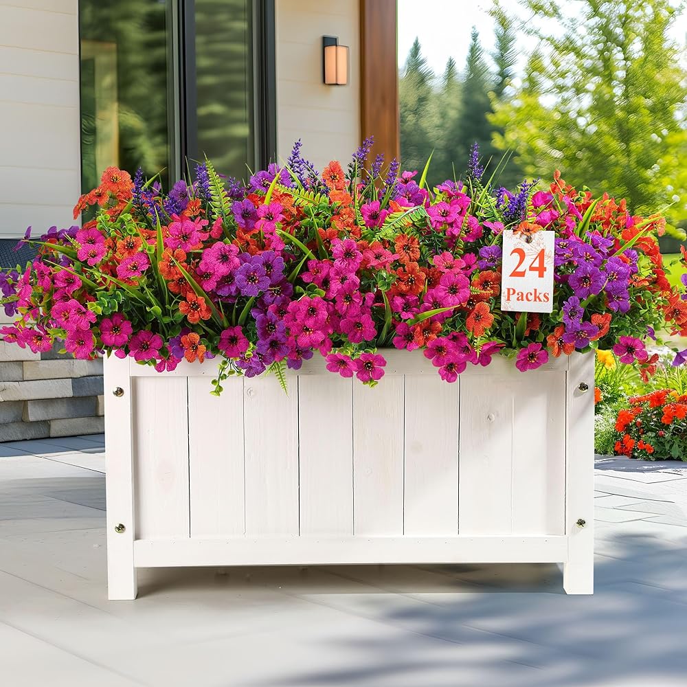 - 🌸【Perfect for Outdoor/Indoor】Plastic flowers are ideal for outdoor porches, walkway, terraces window box, front yard, pots ,hanging planters, gardens, landscape, windowsills, allow you have beautiful color all year around. Also suit for birthdays, weddings, memorial place or grave, they can live anywhere and have withstood heavy rain storms and winds.